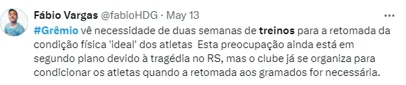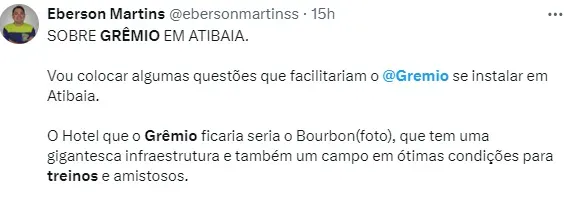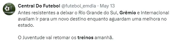 A informação mais quente é que o Grêmio deve anunciar o CT de Atibaia como o espaço provisório para treinamentos. Além disso, o estádio do Bragantino, Nabi Abi Chedid, provavelmente será o estádio que vai sediar jogos, enquanto a Arena está impossibilitada de mandar partidas de futebol.