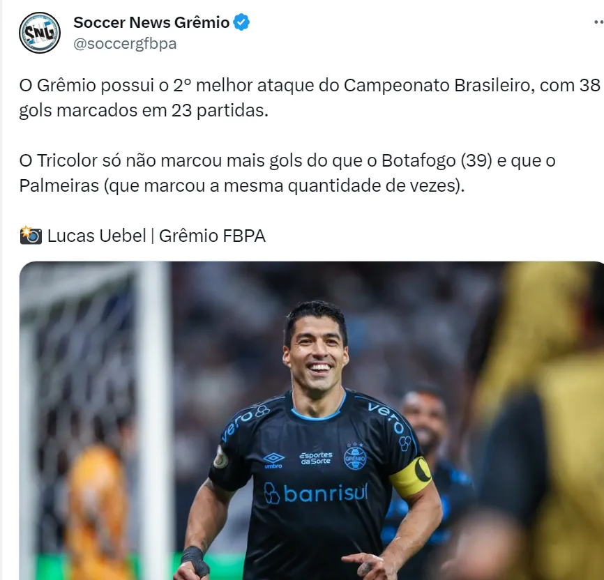 De volta à elite do futebol nacional nesta temporada, o Grêmio faz uma campanha sólida no Campeonato Brasileiro e aparece na terceira colocação, com 40 pontos. O objetivo do Tricolor Gaúcho neste fim de temporada é assegurar uma vaga para a Copa Libertadores de 2024. Duas contratações que surtiram efeito no Imortal foram os estrangeiros Franco Cristaldo e Luis Suárez.