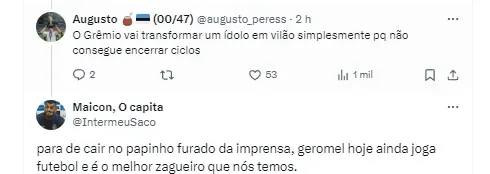 “Para de cair no papinho furado da imprensa, Geromel hoje ainda joga futebol e é o melhor zagueiro que nós temos”. “100% favorável à renovação. Salário baixo, liderança do bem no vestiário e inteligência acima da média entre os jogadores. Como está saudável, não tem motivo pra não renovar até o fim do ano”, aprovaram outros gremistas.