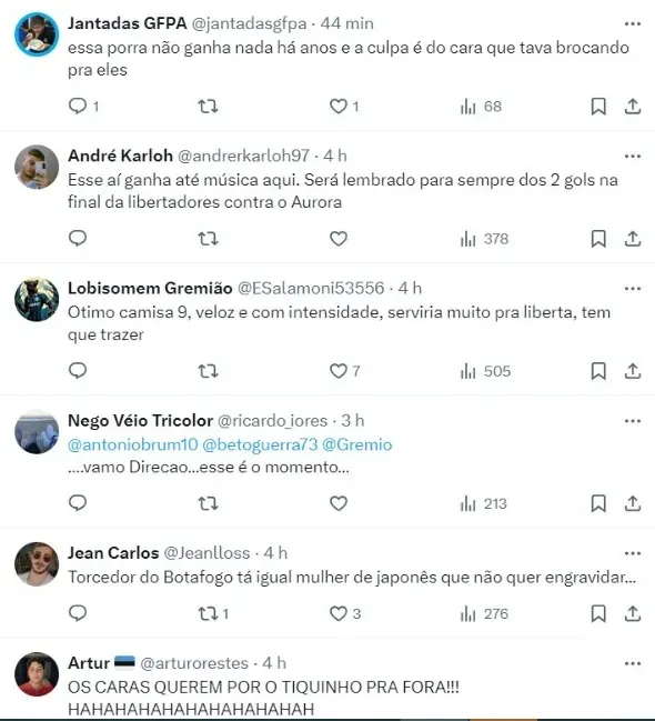 O estafe do jogador também gostou da oferta dos gaúchos e pode ser um trunfo fundamental no poder de convencimento ao dono da SAF do Botafogo para que consiga entrar em um consenso de uma venda ao Rio Grande do Sul.