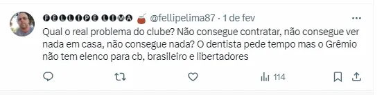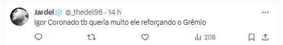 “O nome que está em pauta no mercado, mas, curiosamente, não está na pauta do Grêmio. Ninguém admite que o Grêmio tenha demonstrado interesse, tenha observado ou tenha, inclusive, buscado algum tipo de informação sobre esse jogador”, disse.