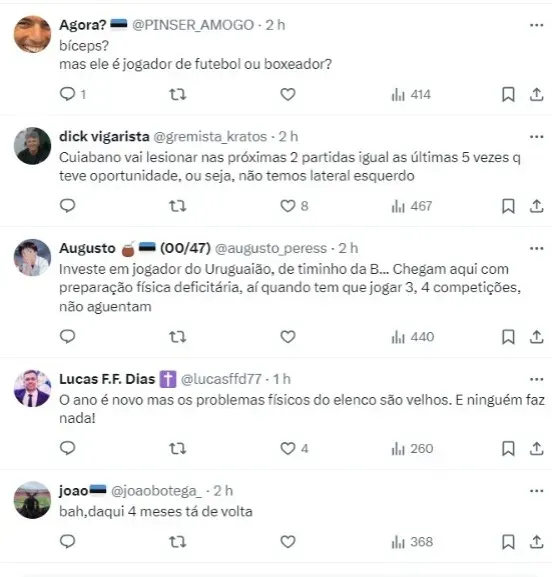Ainda conforme anunciado pelo Grêmio em nota, o jogador foi submetido a uma ressonância magnética após deixar o jogo da última terça-feira (9), pela Libertadores, e já iniciou o tratamento e fisioterapia.