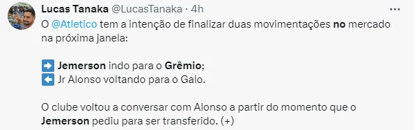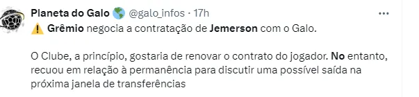 O Imortal tentou contratar Jemerson na janela do início do ano, mas o Atlético Mineiro conseguiu segurar o atleta. Naquela oportunidade o clube mineiro recusou uma proposta de aproximadamente R$ 8 milhões de reais, segundo informações do GE. DesSa vez, a proposta seria de 5 milhões como informou o jornalista Matheus Martins.
