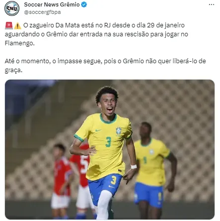 “O zagueiro Da Mata está no RJ desde o dia 29 de janeiro, aguardando o Grêmio dar entrada na sua rescisão para jogar no Flamengo. Até o momento, o impasse segue, pois o Grêmio não quer liberá-lo de graça”, informou o Soccer News Grêmio.