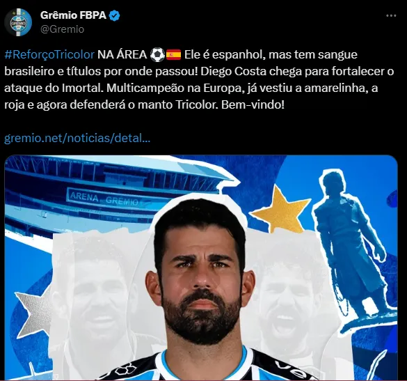 O Grêmio estava na busca por um camisa nove de qualidade após a saída de Luis Suárez, que acertou com o Inter Miami, de Lionel Messi. Depois de tentar muitos nomes, o Imortal acertou a contratação do atacante Diego Costa.