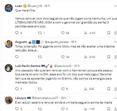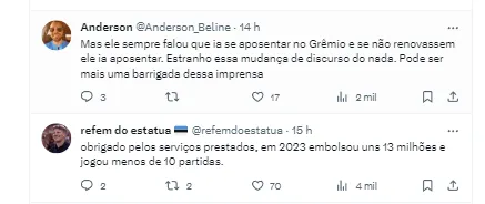 “Geromel tem o desejo de continuar jogando e ainda não pensa em aposentadoria. E, se o Grêmio não fizer a renovação, deverá atuar por outro clube em 2024”, finalizou o post, seguindo as informações de Diogo Rossi.