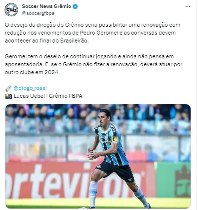 “O desejo da direção do Grêmio seria possibilitar uma renovação com redução nos vencimentos de Pedro Geromel e as conversas devem acontecer ao final do Brasileirão”, iniciou o perfil gremista em sua publicação.