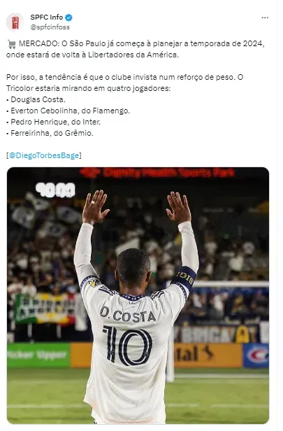 De acordo com o jornalista Diego Torbes, quatro atacantes estão sendo monitorados pelo São Paulo para 2024: Douglas Costa, Pedro Henrique, Ferreirinha e Everton Cebolinha. O quarteto está sendo analisado.