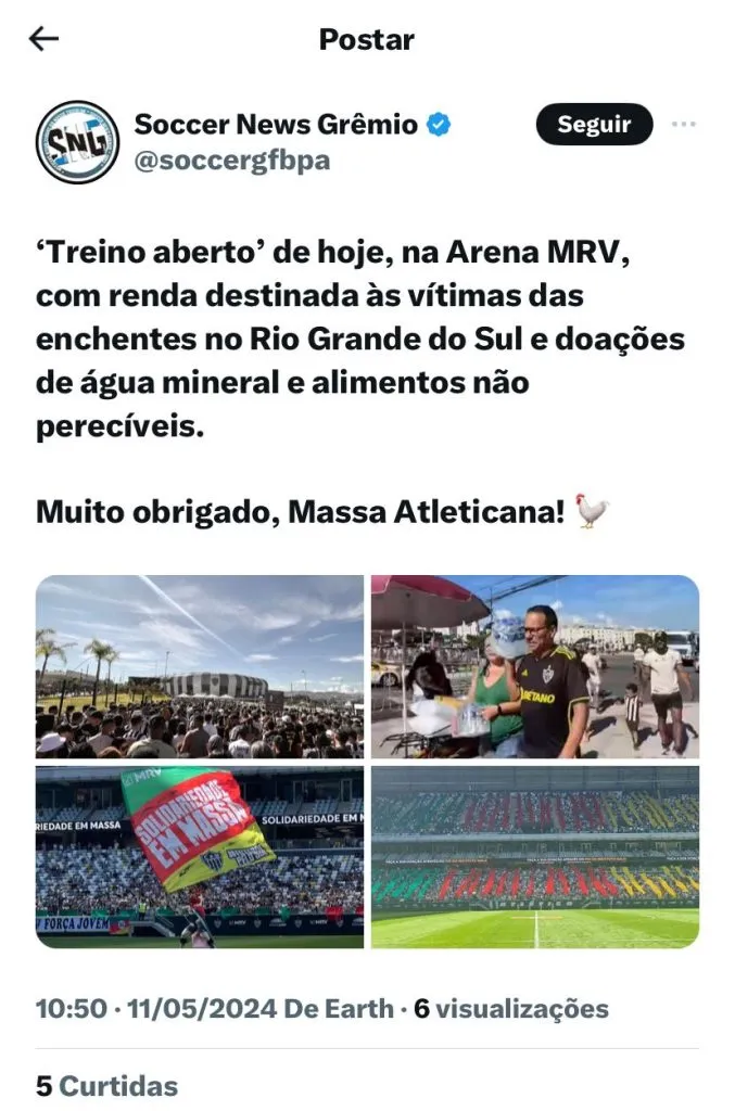 Outros times brasileiros ofereceram suporte e até mesmo cederam seus centros de treinamentos para a dupla gaúcha. Por exemplo, o Atlético Mineiro realiza um treino aberto na Arena MRV neste momento e toda a arrecadação será destinado ao Sul. Resta saber qual será a decisão final: se haverá esse deslocamento ou se ficarão no Sul. Ainda não há muitas atualizações e provavelmente só haverá no decorrer da semana.