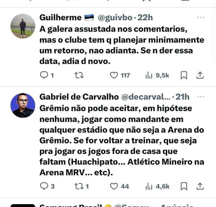 Lembrando que o presidente do Grêmio, Alberto Guerra, ao lado do mandatário do Internacional, se posicionam contra a continuidade do futebol brasileiro. O Rio Grande do Sul passa pela maior catástrofe natural da sua história. Diante dessa tragédia, a prioridade é dar assistência a quem foi prejudicado, e muitos deles são funcionários de ambos os clubes.