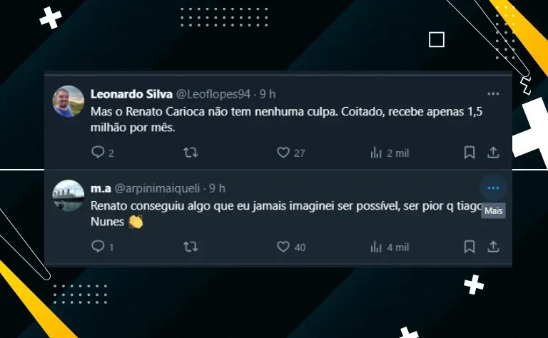 Além disso, algo que chamou atenção dos torcedores foi a mudança de postura brusca do primeiro para o segundo tempo. Segundo o auxiliar Alexandre Mendes, Renato teve papel importante no intervalo: