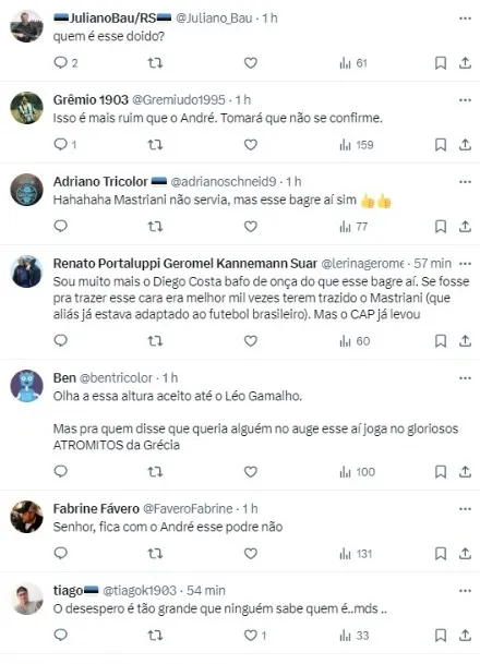 “Aí fica iludindo nosso torcedor com A, B ou C, coisas que nunca saíram de dentro do Grêmio. O Grêmio tem treinador, tem presidente, tem vice-presidente, tem executivo. A gente sempre vai decidir o melhor pro Grêmio”, completou.