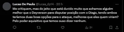 “Foi uma surpresa pra nós. O Deyverson tem histórico gigante na carreira, jogou na Bundesliga, na liga portuguesa, na liga espanhola, Brasileirão. Não há uma pessoa, não há um clube, não há um treinador que o tenha acusado de falta de profissionalismo. É supercompetitivo, briga em todos os treinos para poder ser titular, em nenhum momento se acomoda. É um perfil dele e, quando não é relacionado, obviamente não fica bem”, se manifestou o agente.