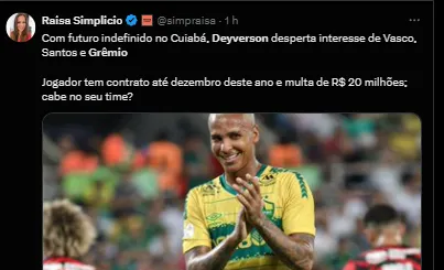 Grêmio quer contratar Deyverson, que já teria pré-contrato com time da Série A; garante presidente do Cuiabá