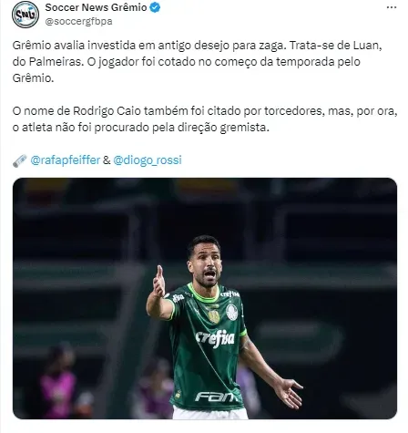 Não é a primeira vez que ele tem seu nome especulado no Tricolor. Ele já havia sido ventilado no time em outro momento. Agora, de acordo com Rafael Pfeiffer, o Imortal quer o jogador do Palmeiras de Abel.