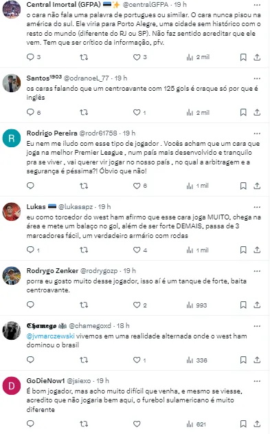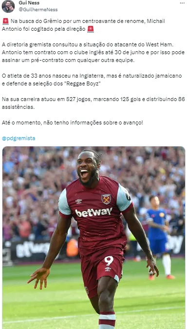 “Na busca do Grêmio por um centroavante de renome, Michail Antonio foi cogitado pela direção. A diretoria gremista consultou a situação do atacante do West Ham”, iniciou o colega em suas redes sociais.