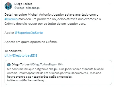“Detalhes sobre Michail Antonio: jogador estava acertado com o Grêmio, mas deu um problema no joelho através dos exames e o Grêmio decidiu recuar por se tratar de um jogador caro”, informou o colega.