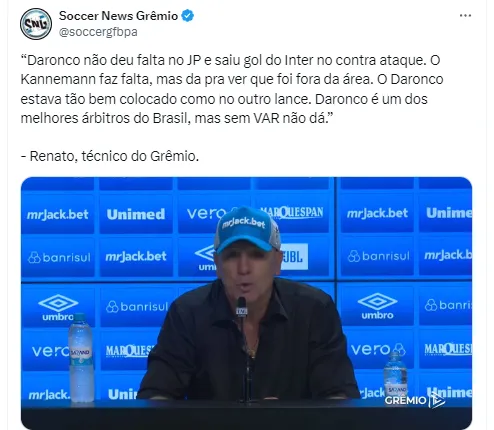 “Daronco não deu falta no JP e saiu gol do Inter no contra ataque. O Kannemann faz falta, mas da pra ver que foi fora da área. O Daronco estava tão bem colocado como no outro lance. Daronco é um dos melhores árbitros do Brasil, mas sem VAR não dá”, finalizou.