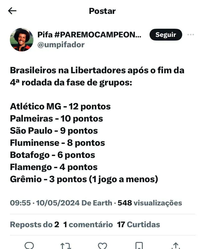 Diante da situação, a classificação do Grêmio na Libertadores foi atualizada. Com a partida contra o Huachipato, no Chile, adiada devido aos acontecimentos recentes, o The Strongest venceu o Estudiantes na noite desta quinta-feira (10), em La Paz. Esse resultado coloca os bolivianos na liderança isolada do Grupo C.