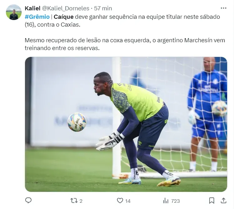 Mesmo com a experiência na posição, Marchesín não é unanimidade da torcida gremista, que vem pedindo que o treinador dê oportunidade a Caíque. O arqueiro chegou no segundo semestre de 2023, e já participou de seis partidas na temporada atual.