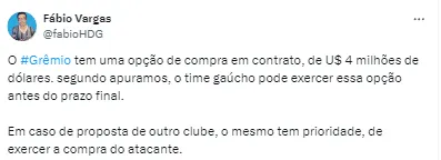 “O Grêmio tem uma opção de compra em contrato, de U$ 4 milhões de dólares. Segundo apuramos, o time gaúcho pode exercer essa opção antes do prazo final. Em caso de proposta de outro clube, o mesmo tem prioridade, de exercer a compra do atacante”, informou Vargas.