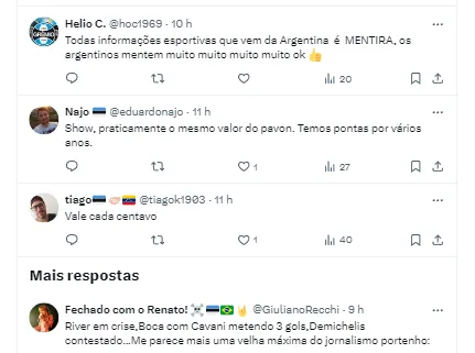 O setorista gremista repercutiu a informação de um portal argentino, sobre o mercado de transferências, de que o River Plate estaria interessado na contratação do jogador. Nos comentários, a torcida do Imortal deixou claro que a equipe não pode perder aquela que talvez foi a principal contratação para 2024.