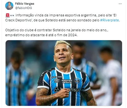 Os torcedores do Grêmio foram pegos de surpresa com a informação vinda da Argentina de que o River Plate estaria interessado em Soteldo. O camisa 10 gremista pertence ao Santos e está emprestado ao time gaúcho até o fim de 2024.