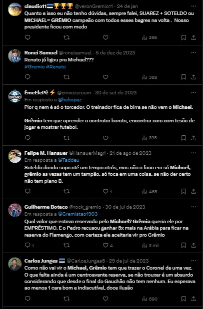 Ainda foi repercutido que outro problema seria o número de jogadores para a posição. Michael atua como ponta e para este setor, o Grêmio tem: Soteldo, Pavón, Gustavo Nunes e Nathan Fernandes.