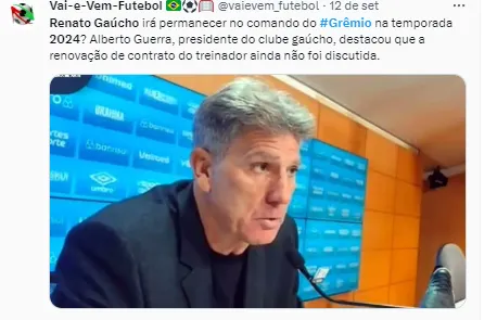 O vice-presidente de futebol do Grêmio, Antônio Brum, revelou que o Tricolor está decidido a manter Renato para o ano que vem, pelo que ele vem fazendo com a equipe, numa temporada em que o time volta da Série B do Brasileirão. Segundo o Lance!, o técnico tem contrato até 2024 e é um dos nomes avaliados para renovação.