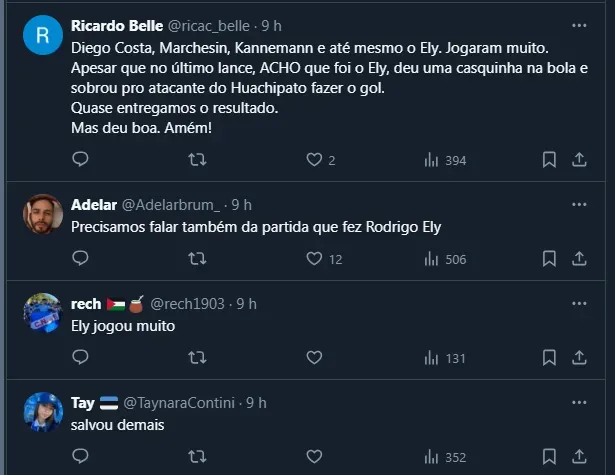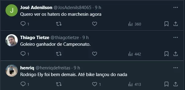 No entanto, mesmo diante de um adversário sem tanta expressão, o Tricolor Gaúcho passou sufoco e alguns nomes se destacaram no jogo e para a torcida, como o goleiro Marchesín e o zagueiro Rodrigo Ely.