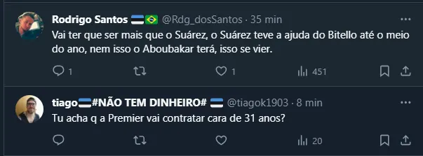 Até por isso, em entrevista à Rádio Gaúcha, o presidente Alberto Guerra resolveu falar sobre o camaronês: “Aboubakar jogou no Porto, fala português, seria uma adaptação mais fácil, mas há toda uma dificuldade, é um atleta que sonha jogar Premier League”, iniciou Guerra.