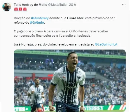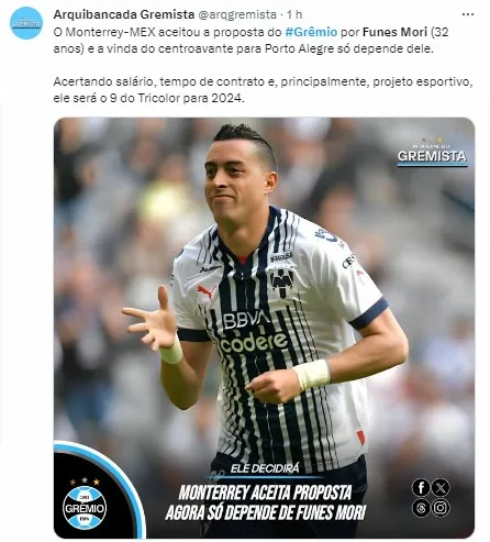 Nos bastidores, o principal nome especulado no Grêmio para ser o camisa 9 em 2024 era o do atacante argentino Funes Mori. Ele é naturalizado mexicano e está no Monterrey. Segundo informações de Marinho Saldanha, do Uol Esporte, o Grêmio avançou na contratação de Funes Mori.