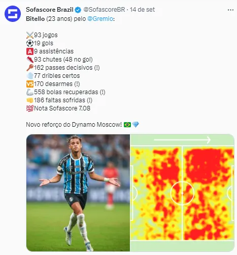 Recentemente, o Tricolor Gaúcho acertou a venda do jovem meia-atacante Bitello ao Dínamo Moscou, da Rússia. O jogador era uma peça muito importante no time gremista e era titular de Renato Gaúcho. Segundo o Transfermarkt, ele fez 42 jogos pelo Grêmio em 2023. Ao todo, ele marcou oito gols e deu cinco assistências.