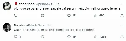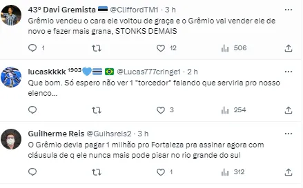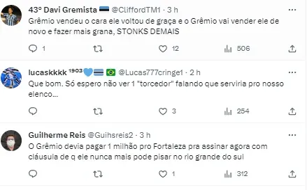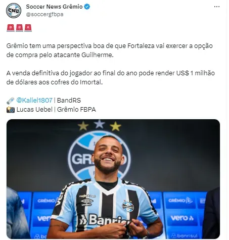 “Grêmio tem uma perspectiva boa de que Fortaleza vai exercer a opção de compra pelo atacante Guilherme. A venda definitiva do jogador ao final do ano pode render US$ 1 milhão de dólares (cerca de R$ 5 milhões) aos cofres do Imortal”, informou Kaliel, conforme postagem do Soccer News Grêmio.