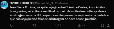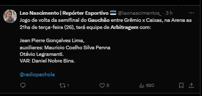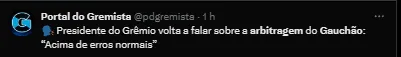 “Então, eu acho que os juízes erraram contra os quatro times, contra o Inter, contra o Caxias, contra o Juventude também, mas nem se compara o que erraram contra o Grêmio nesses jogos, não é? Não só da semifinal, como, enfim, desde o Gre-Nal”, encerrou.