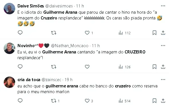 Nas redes sociais, a ação de Arana suscitou uma série de reações. Comentários como “O Arana é muito Galo, deu um migué no hino do Brasil”, “simplesmente o Arana pulando a parte que fala do Cruzeiro no hino nacional” e “simplesmente Guilherme Arana cantando o hino sendo o maior torcedor do Galo” exemplificaram o impacto do momento.