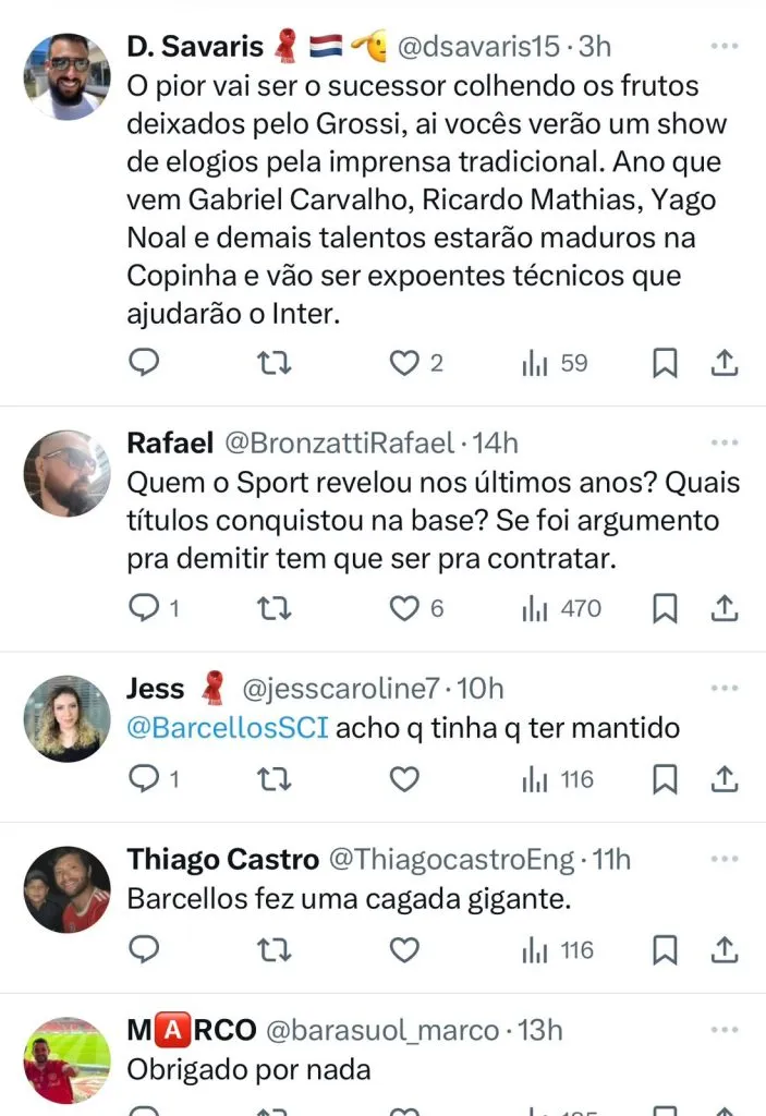 “O Sport Club Internacional comunica que o Diretor Esportivo da categoria de base Gustavo Grossi deixa o cargo. O Clube agradece o profissionalismo e pelos serviços prestados no período. Desejando sorte e sucesso na sequência de sua carreira”, disse a nota oficial do Clube.