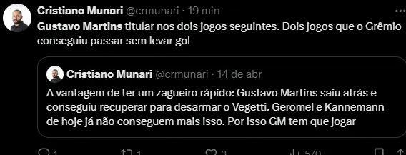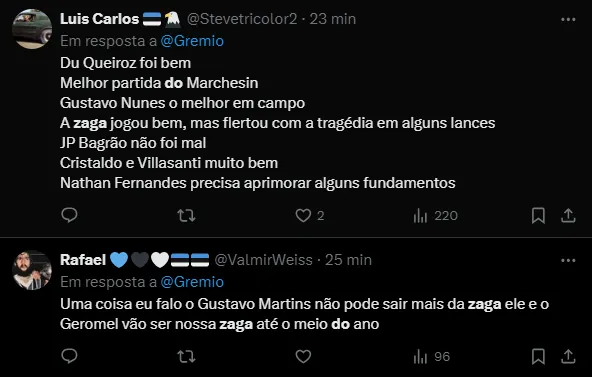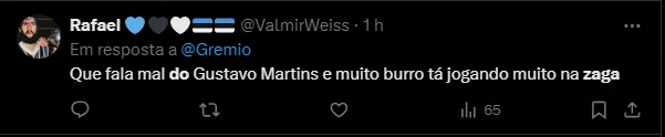 “Uma coisa eu falo o Gustavo Martins não pode sair mais da zaga ele e o Geromel vão ser nossa zaga até o meio do ano”, “O Martins tá salvando a zaga do Grêmio” e “Gustavo Martins titular nos dois jogos seguintes. Dois jogos que o Grêmio conseguiu passar sem levar gol“, foram alguns comentários.