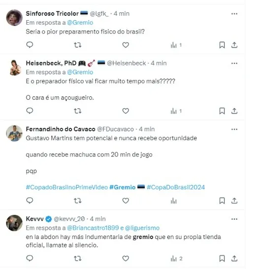Gustavo Martins. Mais uma lesão muscular no Grêmio. A preparação física e fisiologia tem que ser fortemente cobrados. Jogadores sendo poupados toda hora e mesmo assim se machucam“, disse um torcedor do Grêmio.