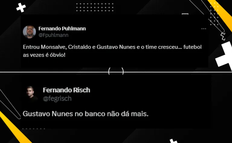 “Gustavo Nunes é umas 700x melhor que o Pavon, e não acho ele nem perto de ser craque”, destacou outro. “Se o Gustavo Nunes não virar presença constante na seleção eu vou ficar bem decepcionado! Joga muito”, elogiou um terceiro.
