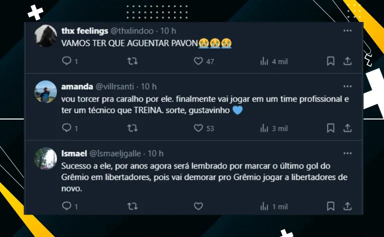 “Queria muito ter saído com a vitória, mas fico feliz por ter feito o gol ali, agradeço a todos os torcedores e ao Grêmio. Quero agradecer a todos os torcedores por ter confiado no meu trabalho, no meu potencial, e por ter feito parte desse grupo. Tenho viagem marcada na sexta-feira”, destacou o garoto.