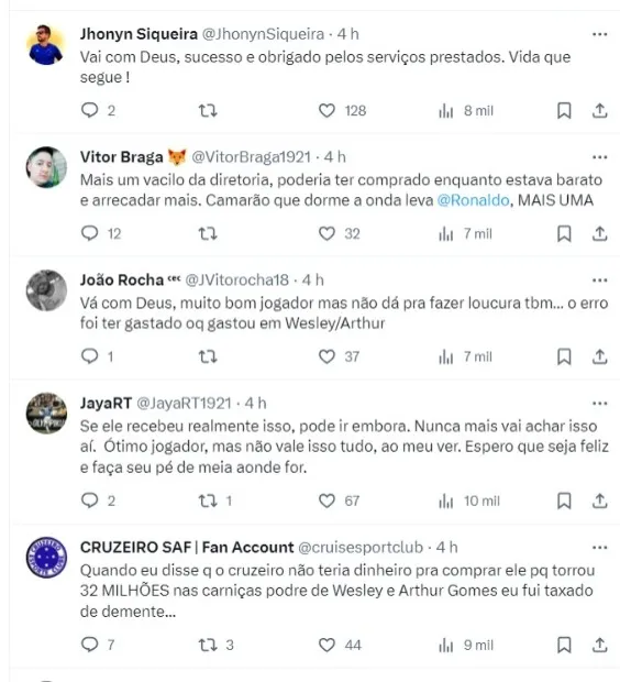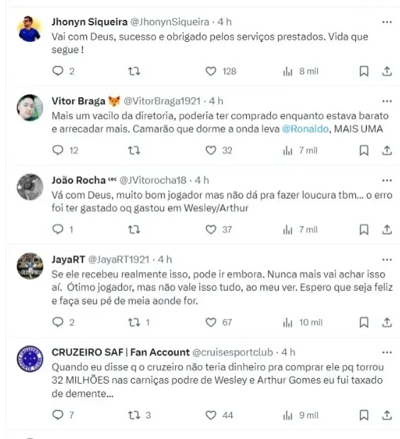 “Bruno Rodrigues NÃO fica no Cruzeiro. O Cruzeiro fez uma oferta de renovação, mas ouviu do jogador que ele tem uma oferta em mãos de 4.8 de euros, com luvas de 2M e salário alto pro padrão Série A. Com esses valores ficou inviável Cruzeiro manter o atleta e já sabe que não ficará”, disse o jornalista André Hernan.