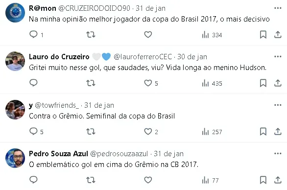 Hudson também falou sobre sua adaptação ao Cruzeiro e a recepção calorosa que recebeu no clube. Ele expressou gratidão pelo apoio dos torcedores e destacou o orgulho de ter contribuído para um momento histórico do time. A conquista da Copa do Brasil de 2017, em particular, é uma lembrança que ele guarda com carinho.