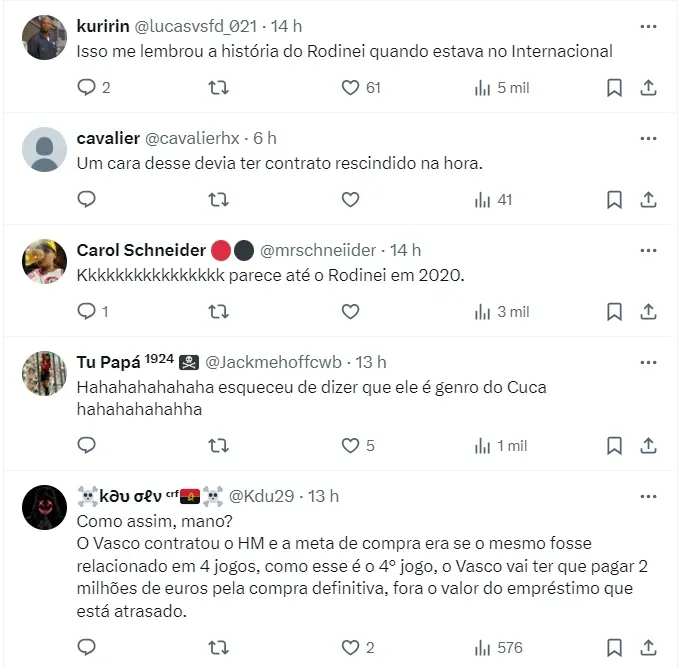 Diante disso, através das redes sociais, os torcedores Cruz-Maltino se revoltaram com o erro cometido por Hugo Moura e chegaram a pedir que ele não jogue pelo clube. Destacando que sua relação extracampo com a filha de Cuca pode ter interferido na situação.