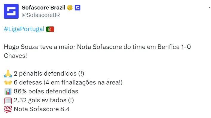 As duas outras defesas foram em cobranças do brasileiro Arthur Cabral. A primeira bola parou no goleiro, emprestado pelo Flamengo. O VAR, porém, flagrou invasão, e a cobrança foi repetida. O atacante brasileiro voltou a bater, mas Hugo brilhou. Ele foi vazado por João Neves, que garantiu a vitória.