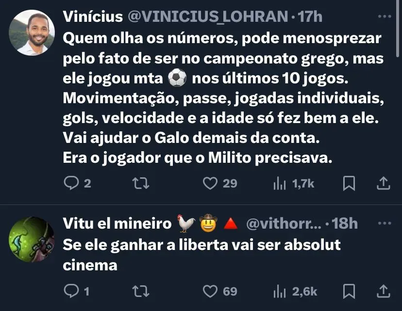 “Não conversei ainda, mas tenho certeza que será uma peça fundamental ao plantel. É um cara que conhece a casa, é amado pela torcida. Vem com muita vontade para somar e para continuar escrevendo a sua história com o clube. Ele ganhou coisas grandes aqui. Estamos ansiosos.”, diz o ídolo do Atlético.