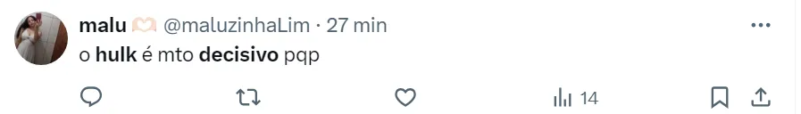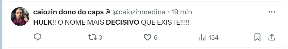 “HULK!! O NOME MAIS DECISIVO QUE EXISTE!!!!!”, escreveu uma torcedora em Caps Lock na rede social. Veja outros comentários da massa atleticana ao fim da matéria em relação ao camisa 7, que terminou o Campeonato Mineiro com sete gols em 10 jogos.