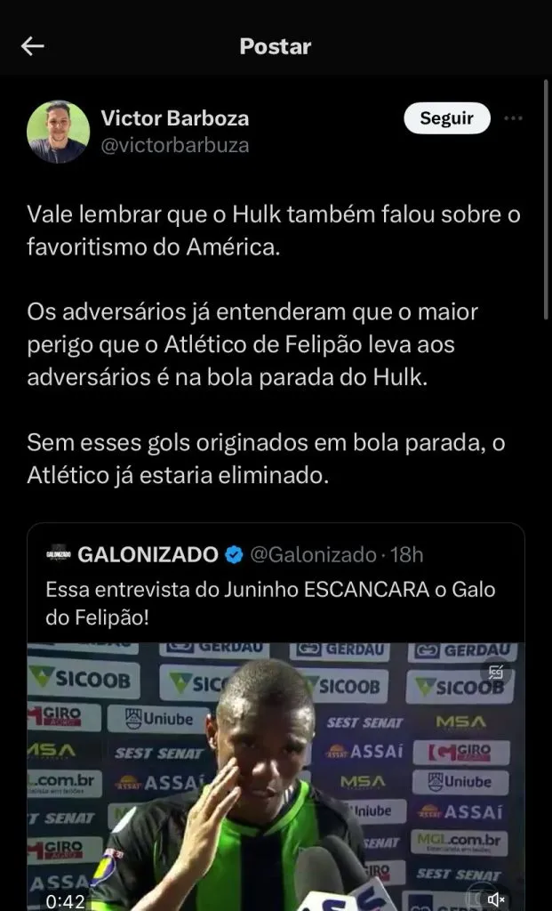 Hulk também não deixou de elogiar o América, além de falar sobre o capitão do rival, Juninho: “Falei ontem que hoje seria um grande jogo, diante de uma equipe muito bem treinada, que está muito motivada e com o emocional lá em cima. Ainda não perderam no Campeonato Mineiro”, iniciou.