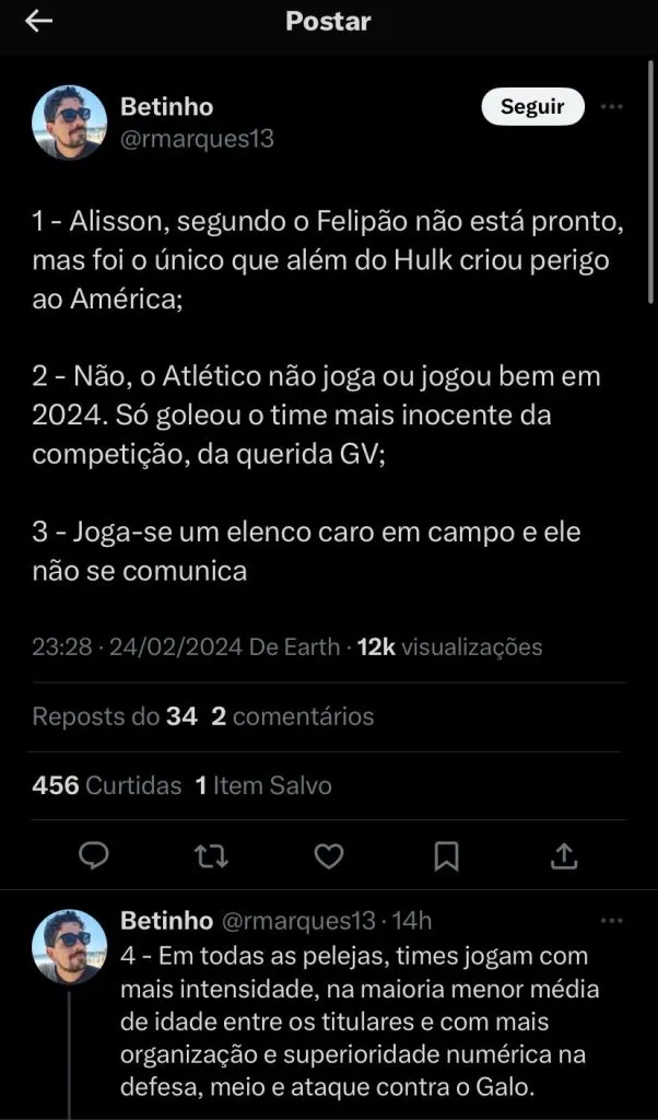 O primeiro tempo do Atlético foi bem ruim mesmo, tanto que o América passou a maior parte do tempo ganhando, o gol só saiu nos acréscimos finais da partida. Os destaques ficaram para Alisson, Hulk e o autor do gol Rubens.