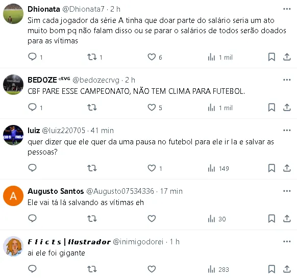 Dessa forma, ele manifestou seu apoio à eventual paralisação das competições esportivas se isso contribuir para mitigar os impactos das enchentes e auxiliar as comunidades afetadas.